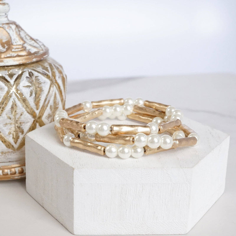 Pearls & Antique Gold Tube Beaded Bracelet Set – Effortless Elegance