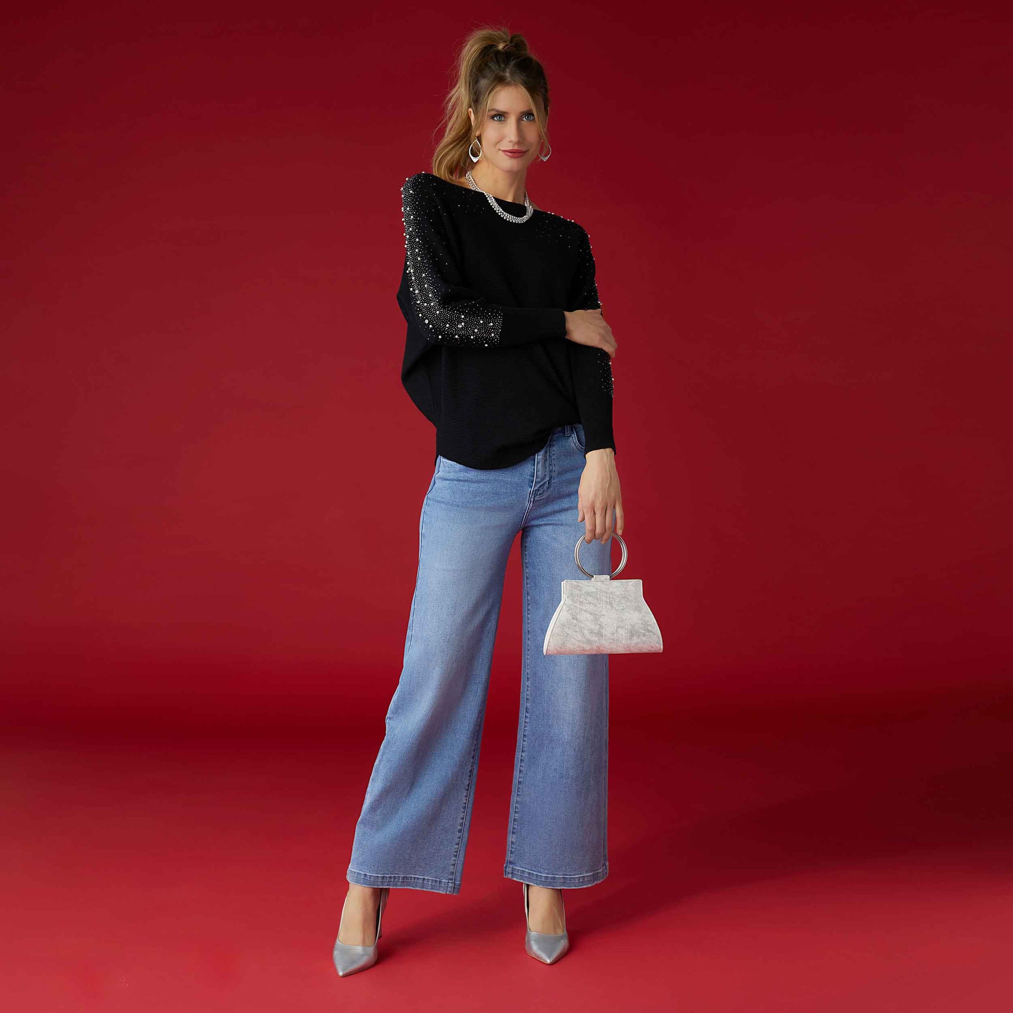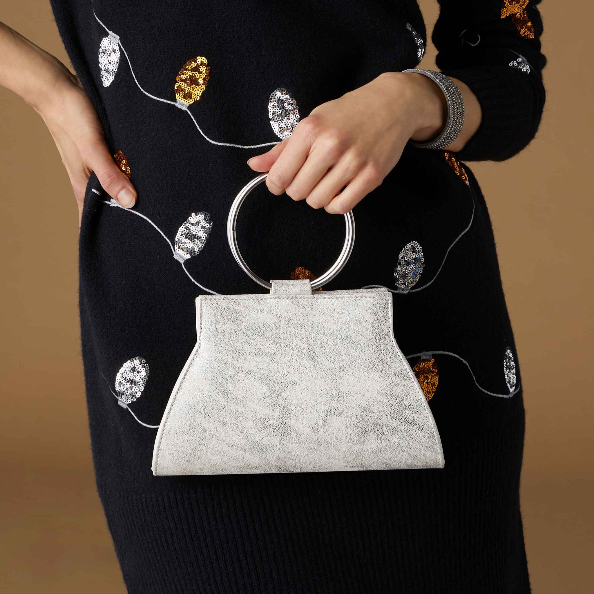 Metallic, shimmery vegan leather with slim profile. Graphic circular wristlet ring and metal chain crossbody strap. Materials: Metallic Vegan Leather. Dimensions: 9"W x 5.5"H x 1.25"D.